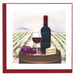 Invite a friend to a wine tasting at the vineyard with our quilled vineyard greeting card. This card perfectly captures the beauty of a vineyard in the summer. The card features a wine barrel in the foreground with a bottle of wine, filled glass, bunch of grapes and a slice of brie cheese on top of it. Behind the quilled elements is a beautiful, printed background of a vineyard landscape.