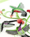 Send this beautifully quilled Hummingbird Trio greeting card to any nature lover in your life! Aztecs believed hummingbirds were messengers between them and the gods and now this handcrafted card will be the messenger between you and your loved one. The design features three hummingbirds fluttering around an abstract swirling green vine with red flower bulbs.